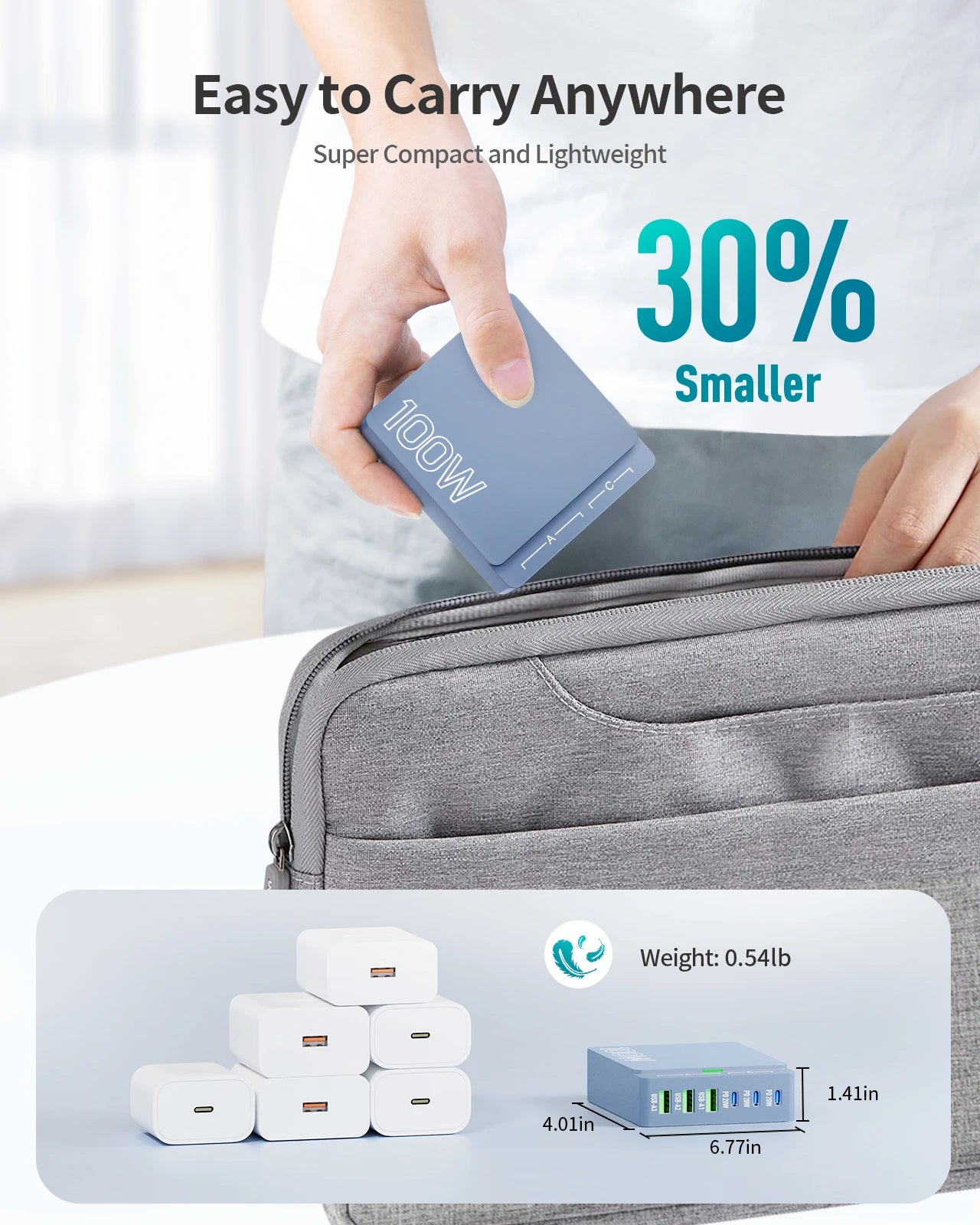 100W 6-Port GaN Fast Charging Hub - PD 3.0 Type C and USB A Charging Case - For Cell Phones, Tablets, and Laptops - Blue