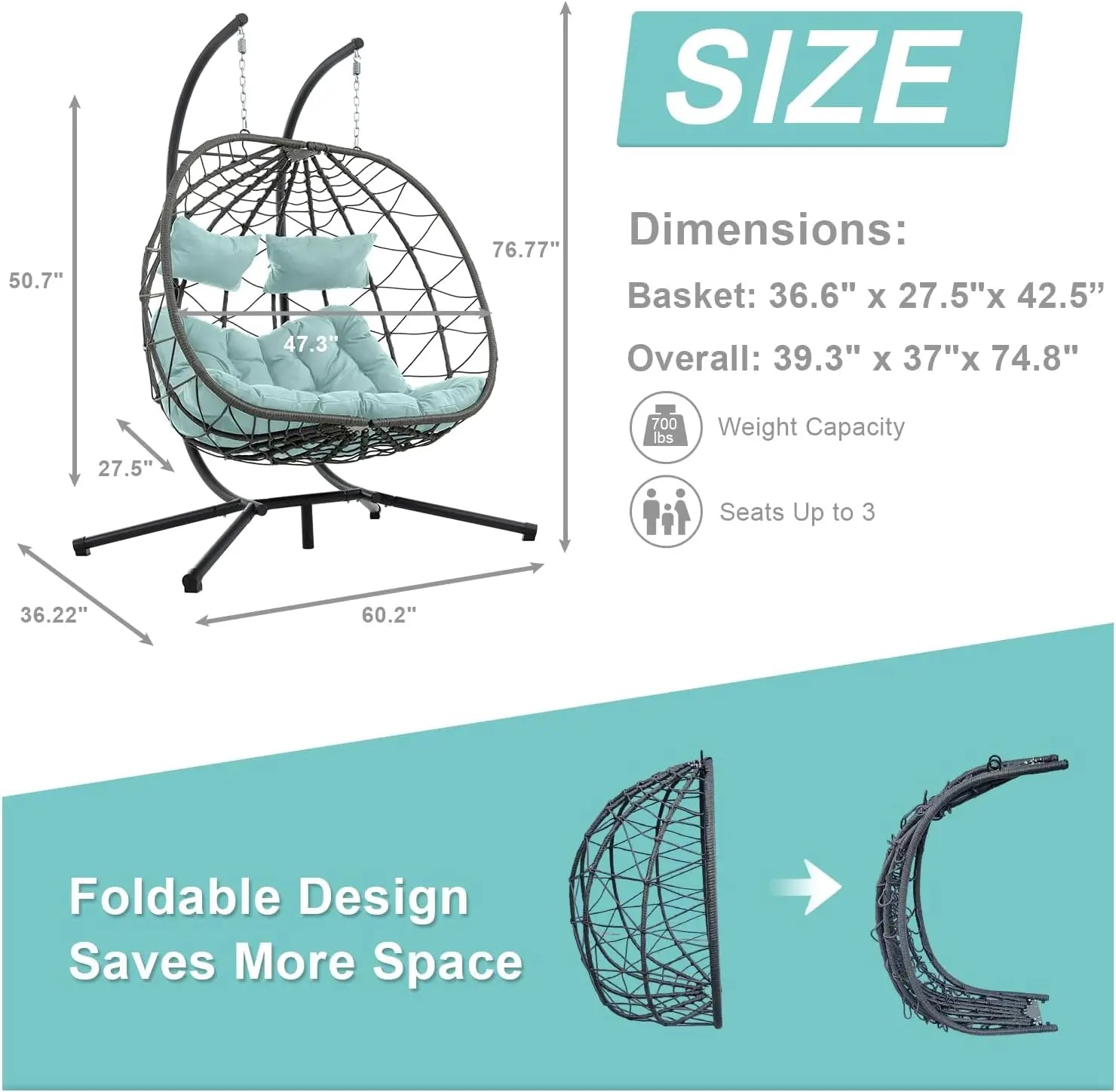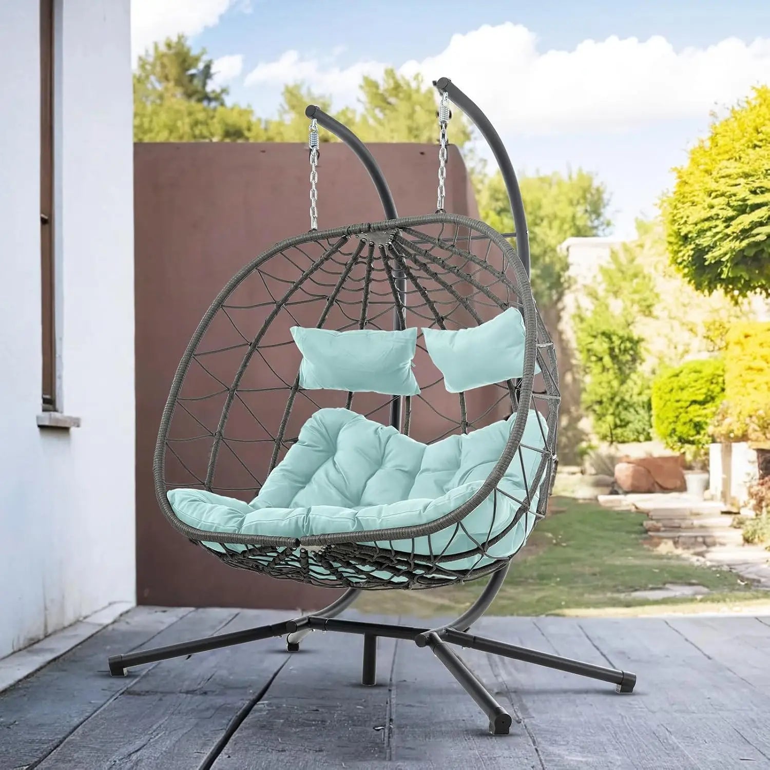 2 Person Double Egg Swing Chair with Stand Indoor Outdoor, Hammock Swing Chair Foldable Hanging Chair, Patio Wicker