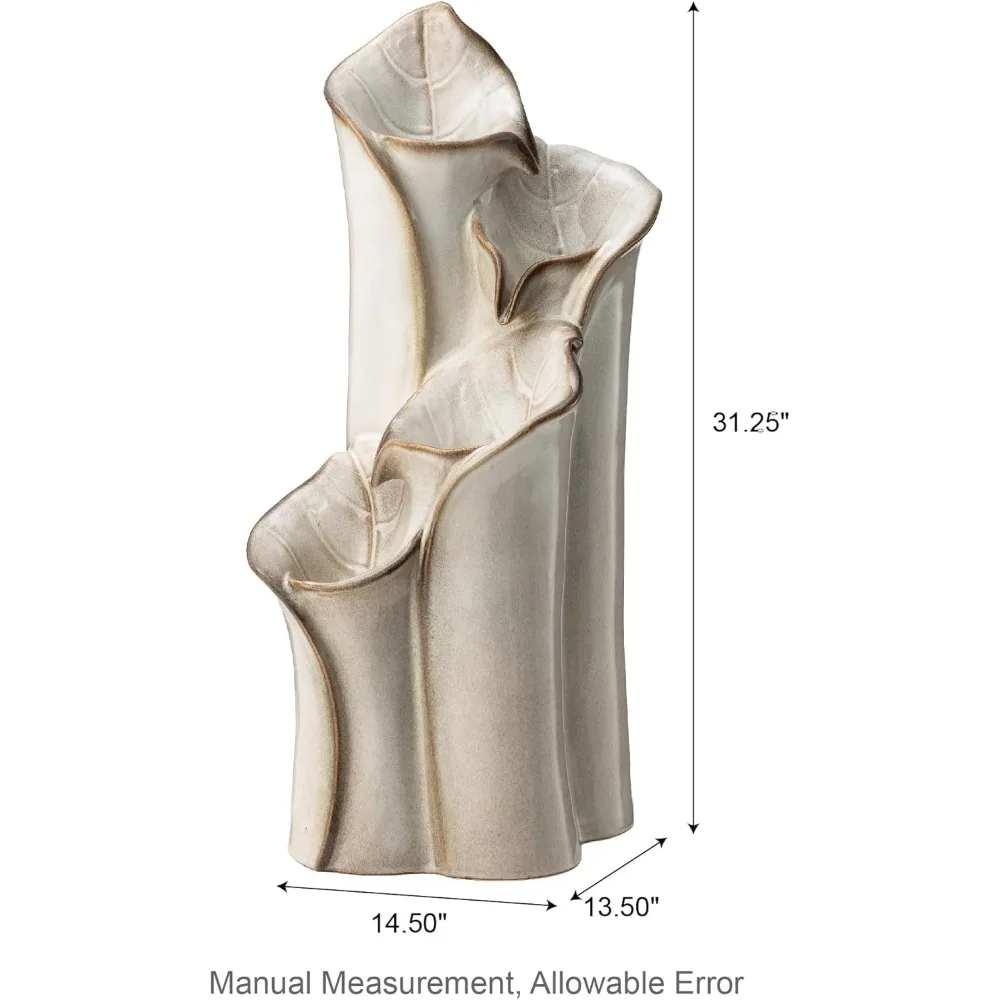 31.25" H Outdoor Water Fountain with LED Lights and Pump, 4 Tier Sand Beige Lotus Leaf Textured Ceramic Floor Standing Fountain