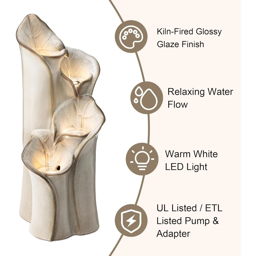 - Unique Design: This ceramic water fountain features an elegant and charming kiln-fired glossy sand beige glaze with delicate lotus leaf texture, 4-tier vase-shaped design adorned with lotus leaf texture brings vibrant water flow and natural elegance. Each basin is equipped an LED light, the trickling water ripples and sparkles in the warm glow, adding visual interest that is sure to transform your space into a tranquil, romantic, charming and pleasing environment