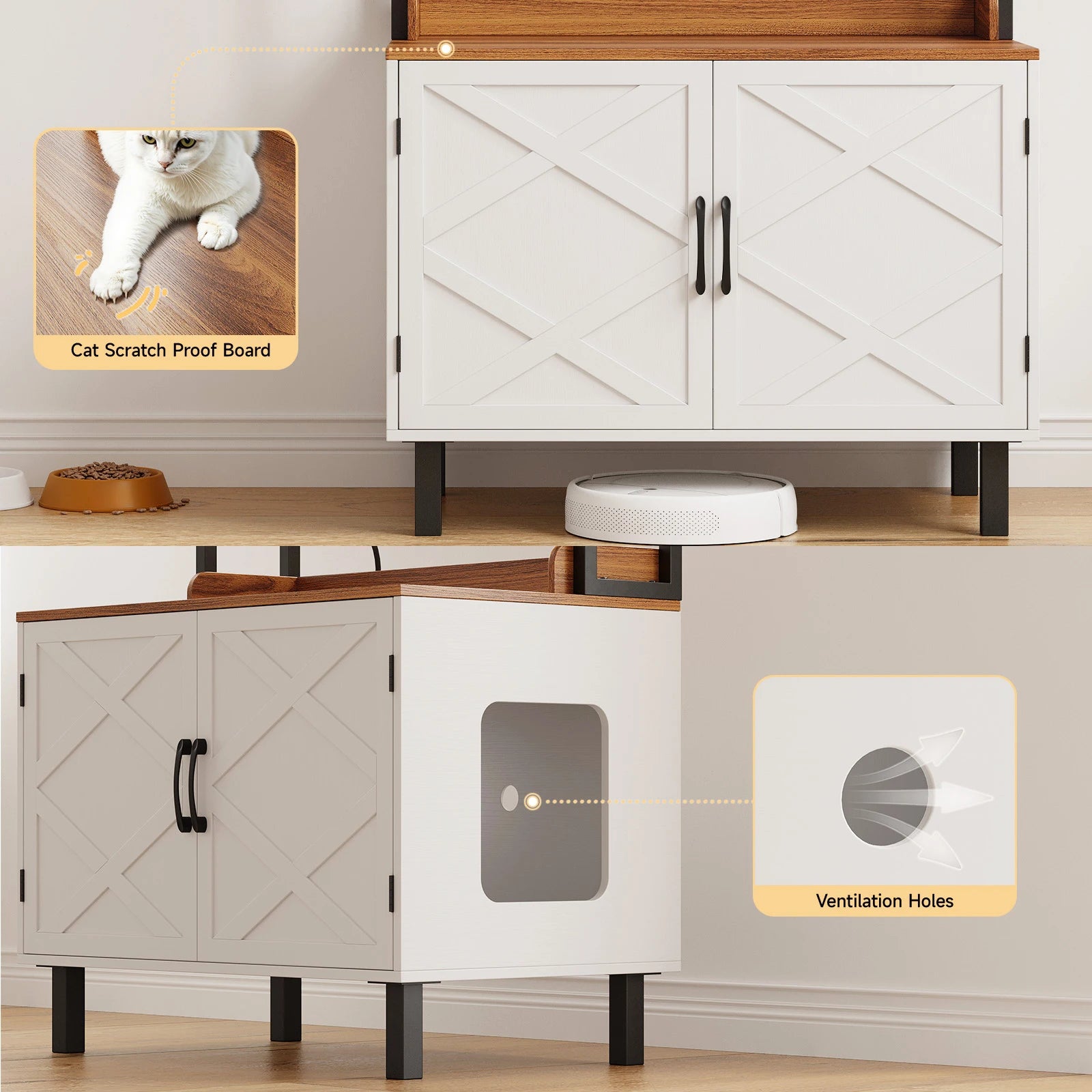 The elegant and stylish cabinet of the hidden cat litter box furniture combines contrasting colors and fork-shaped design, which can easily blend into your home style. The magnetic double door design provides convenience for daily cleaning and changing cat litter!Sturdy and easy to clean: