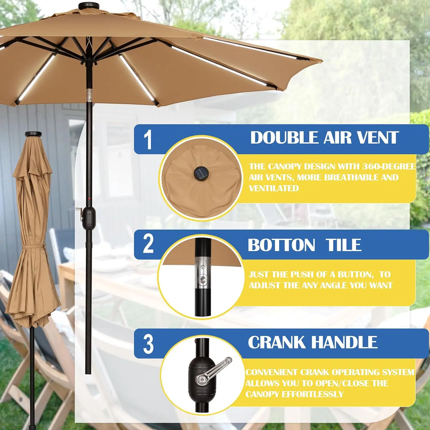 9FT Outdoor Solar LED Lighted Patio Umbrella with 8 LED Strip Lights & 8 Ribs, Convenient Crank Lift System
