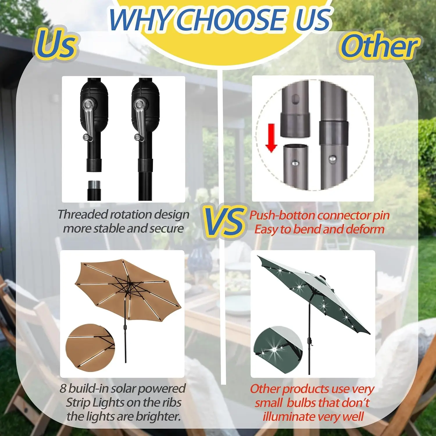 【Energy-Efficient Lighting】Our iron lighted outdoor table umbrellas have 8 build-in solar powered Strip Lights on the ribs,the lights are brighter. After charging in all-day direct sunlight, it can be used for close to 5 hours at night. No electricity or power cords are required, making it more energy efficient, allows you to enjoy the outdoors after dark.