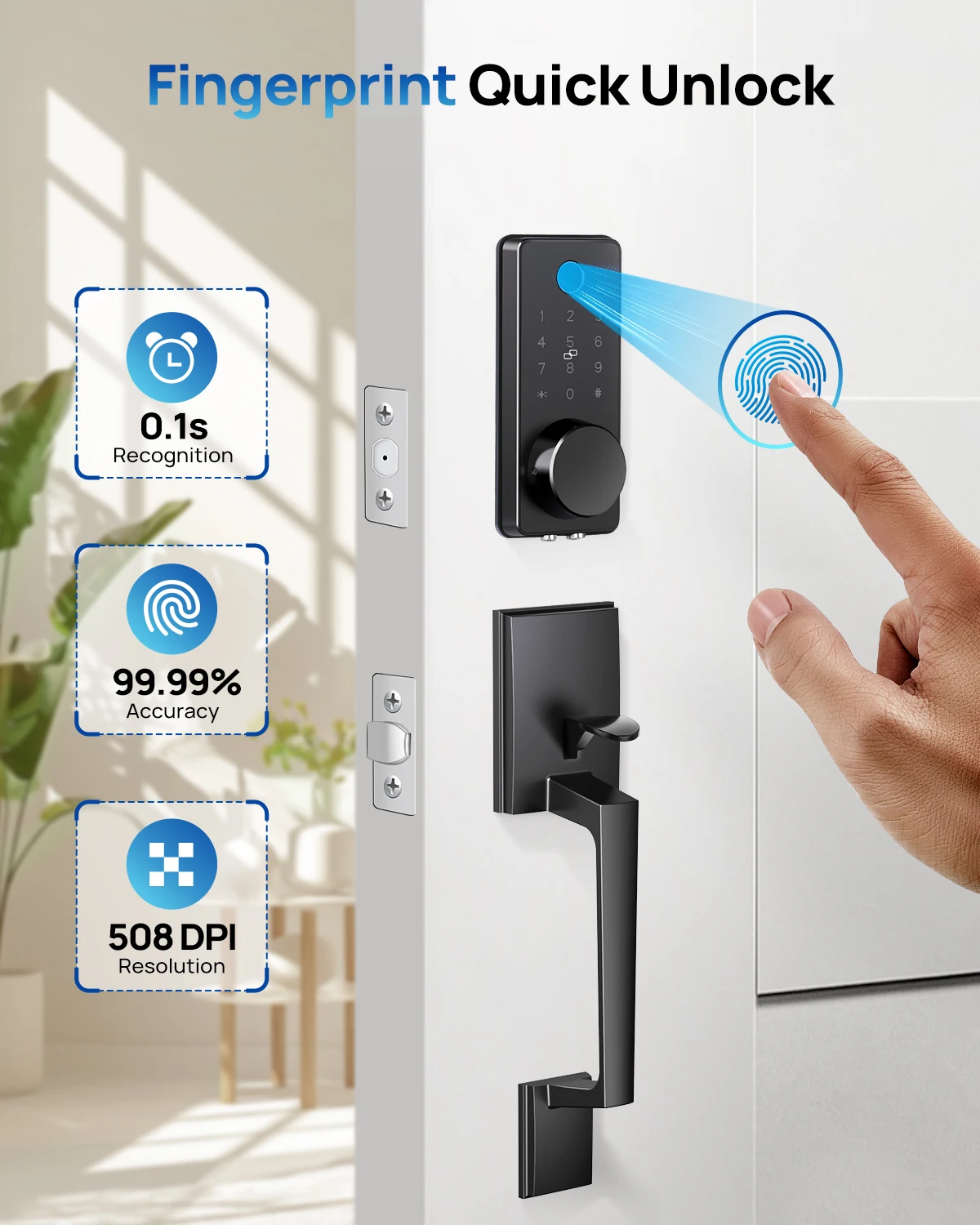 2.Secure fingerprint unlock in just 0.1s with 160x160 pixels recognition and 508 DPI scanner. Accommodate up to 100 fingerprints for frequent guests or additional finger options for yourself.
