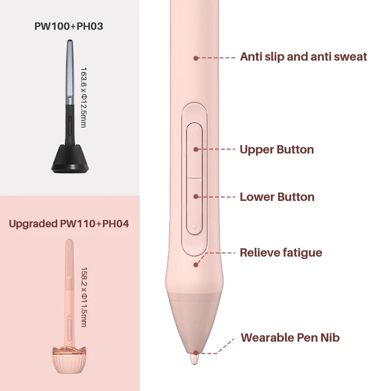 Inspiroy 2 comes with the battery-free pen PW110, which is thinner than PW517. The pen extends the silicone grip length and sinks the pen's two programmable buttons to prevent accidental press. All these improvements add up to greater comfort while using. You can still enjoy the drawing stability with a shorter retraction distance and 8192 levels of pressure sensitivity. An ergonomic pen holder is included as well.