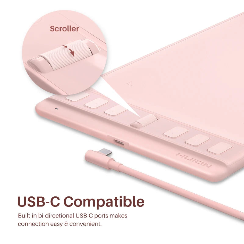 Equipped with 6 programmable press keys, you can set different functions. The press keys are much easier to navigate due to the bar height (2mm higher than the drawing surface), the color difference between the press keys and the bar, and the bumps on the press keys. Furthermore, Inspiroy 2 includes a very handy Scroller, sensitivity of whom can be adjusted in the driver, similar to a mouse scroll wheel.
