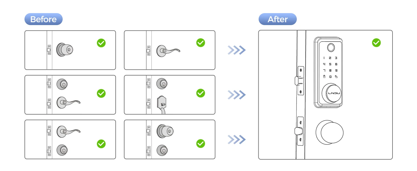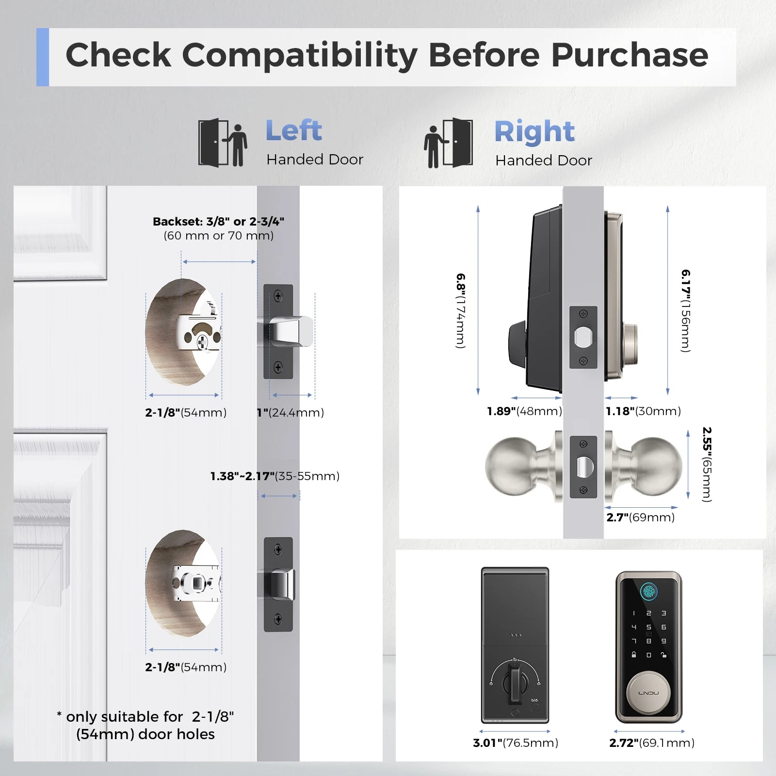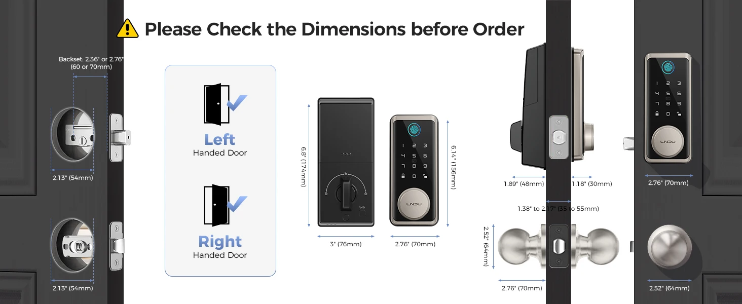 Easy Installation: LNDU door fingerprint lock can be easily installed in minutes with a screwdriver. This door keypad lock seamlessly fits both left and right door orientations, offering universal compatibility. Keyless entry door lock fit door thicknesses from 1-3/8" to 2-1/8" (35mm - 55mm), backset 2-3/8" (60mm) and 2-3/4" (70mm)