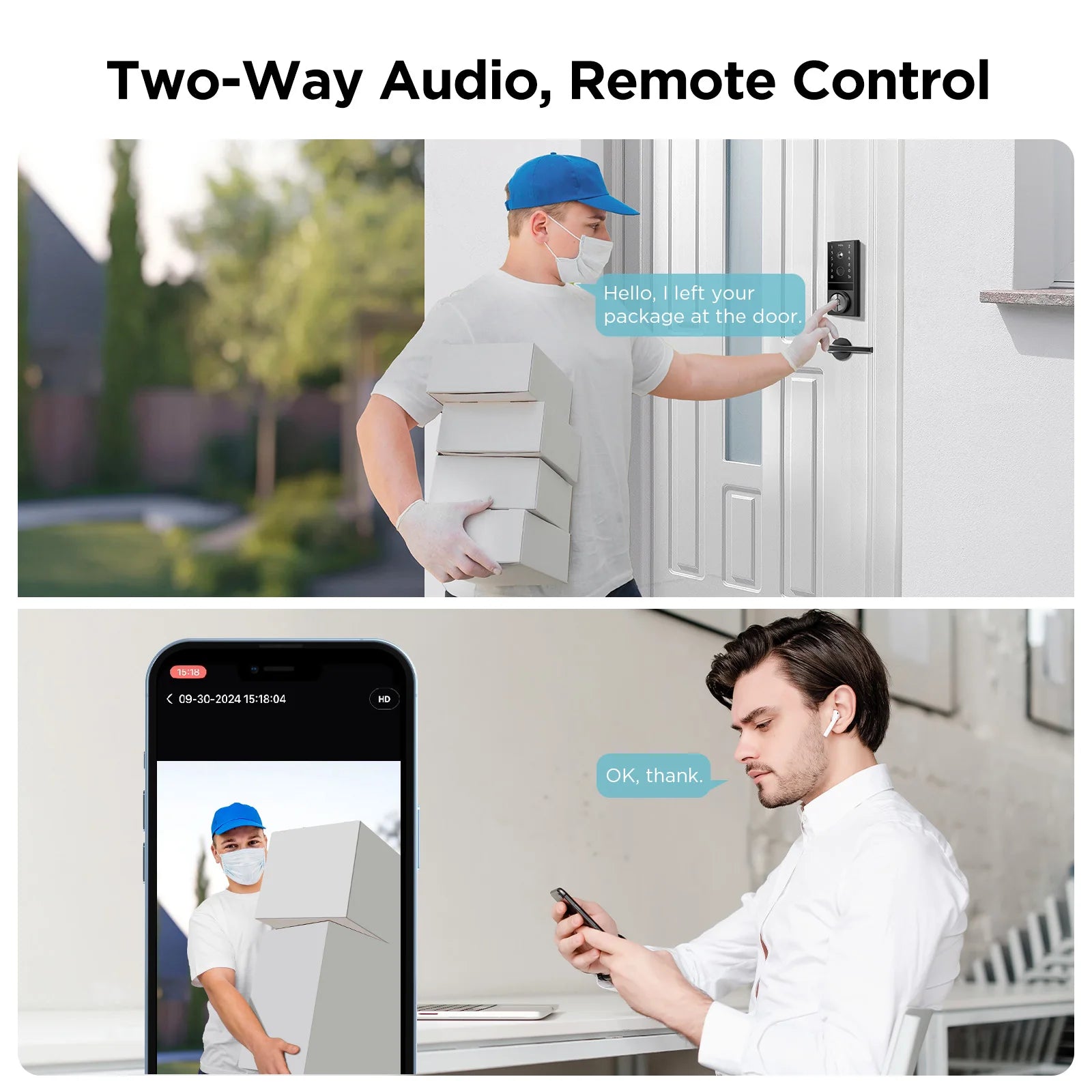 This smart deadbolt lock features a 172ยฐ wide-angle lens with 2K quality video and images. The built-in microphone and speaker enable smooth, clear conversations with visitors, allowing you to send verbal warnings or chat. Ideal for pet owners, parents, and caregivers.
