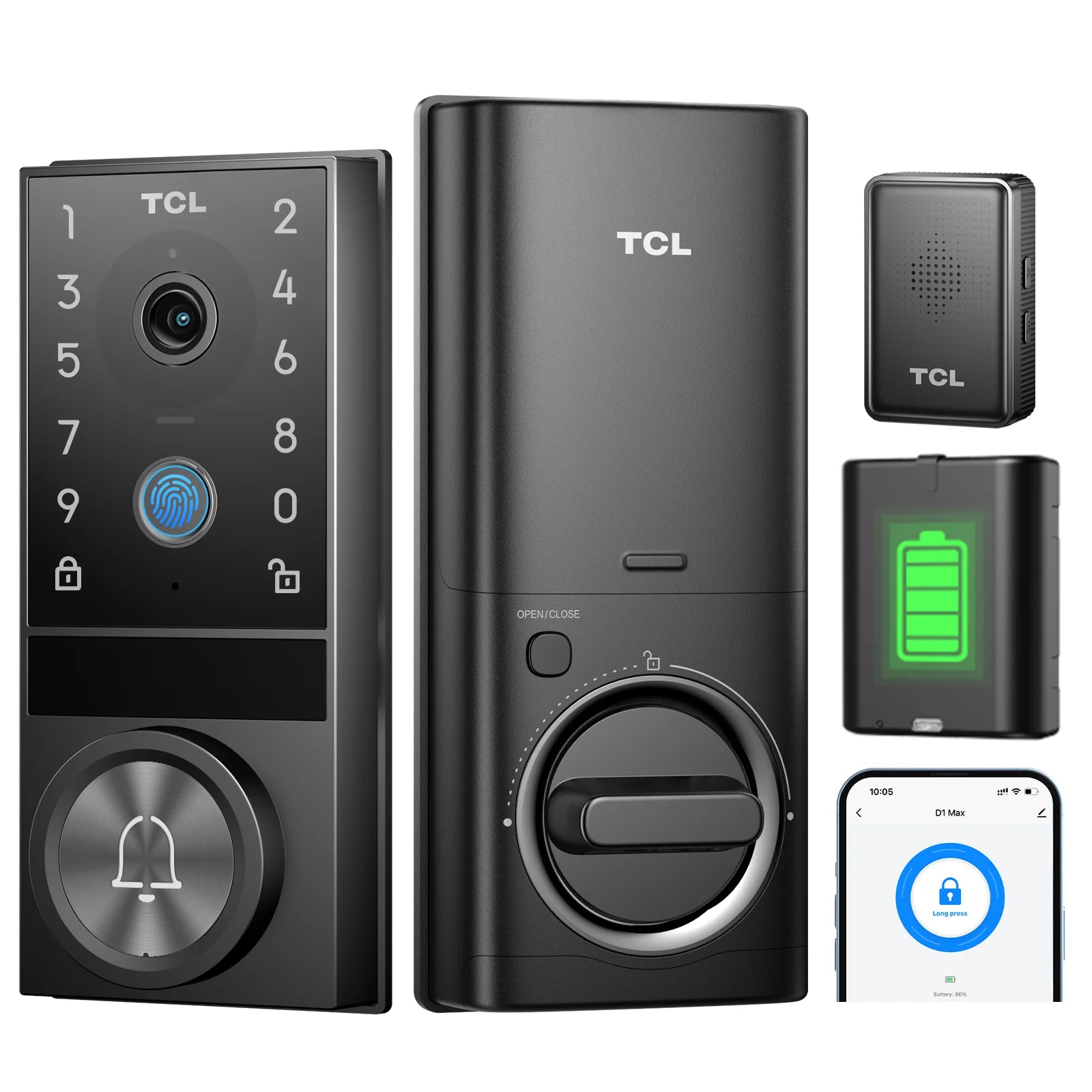 TCL D1 Max Security Video Smart Lock 2K Camera Doorbell & Fingerprint Keyless Entry 3-in-1 WiFi Door Lock PIR Motion Detection