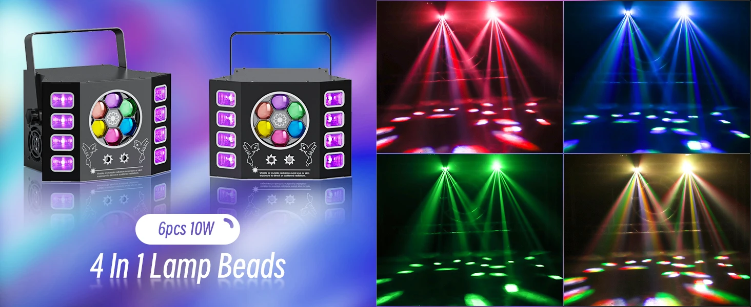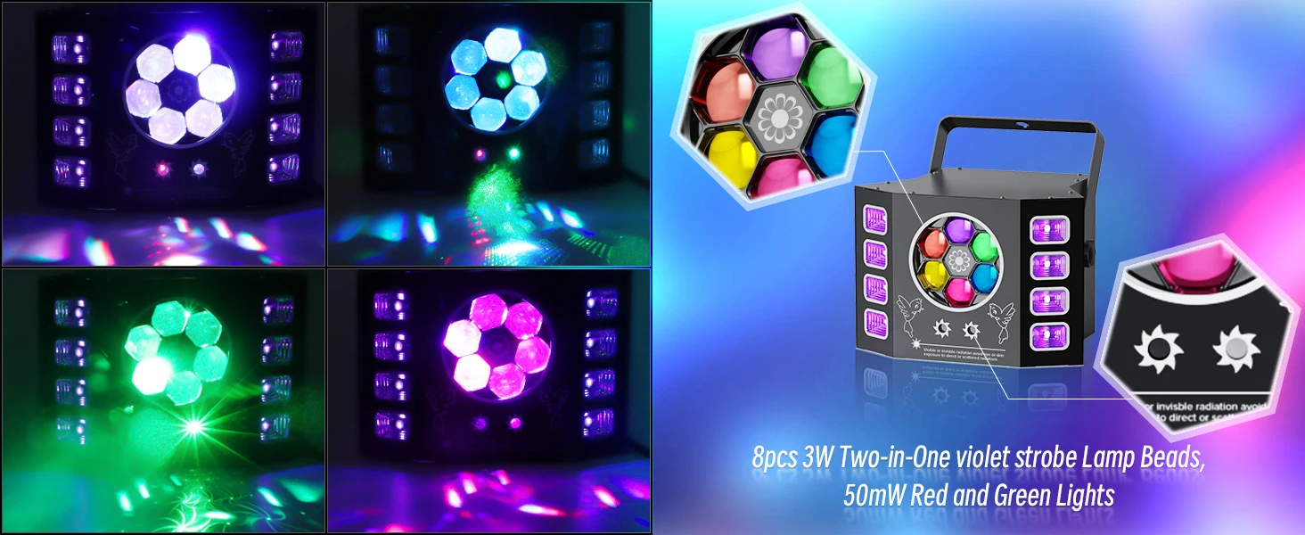 Lamp bead parameters: 6pcs 10W four-in-one lamp beads, 8pcs 3W two-in-one violet strobe lamp beads, 5.5W violet lamp beads