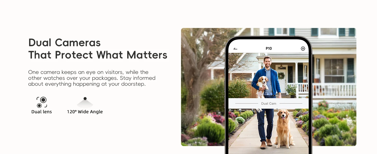 Keep an eye on every angle with dual lens doorbell camera—one for close-up and one for full view, ensuring no blind spots at your doorstep(2.4Ghz WiFi Only)