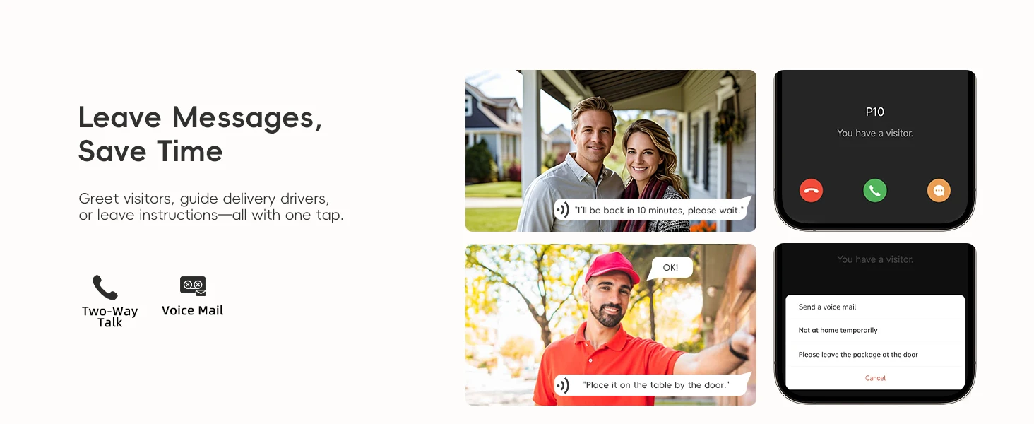 Communicate directly or change your voice for added security. Designed to facilitate communication with visitors or deter intruders in real time